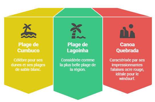 - Canoa Quebrada : caractérisée par ses impressionnantes falaises ocre rouge, idéale pour les amateurs de windsurf et de kitesurf